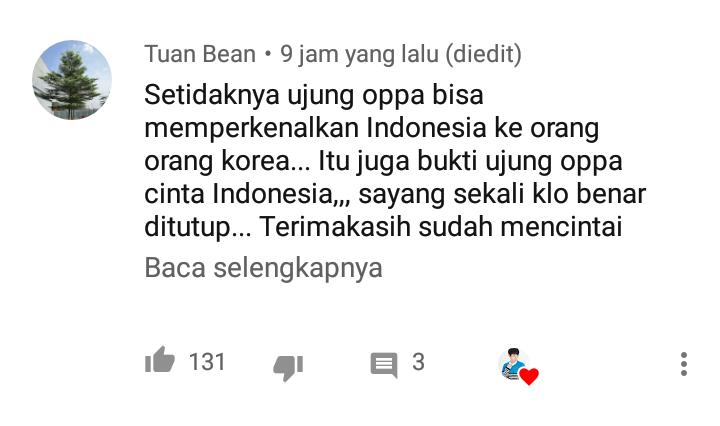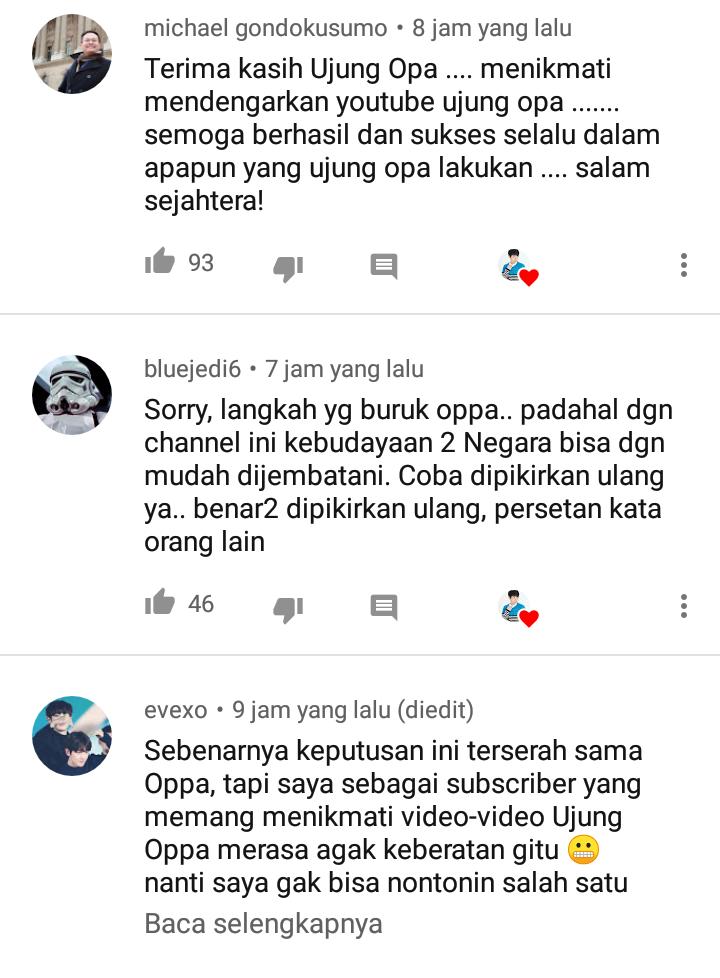 "Oppa aku udah follow Ujung Oppa dari tahun 2017... Yah nggak seru banget kalau Ujung Oppa tutup channel... Please oppa jangan ditutup channelnya," tambah Zikha Indriyati.
